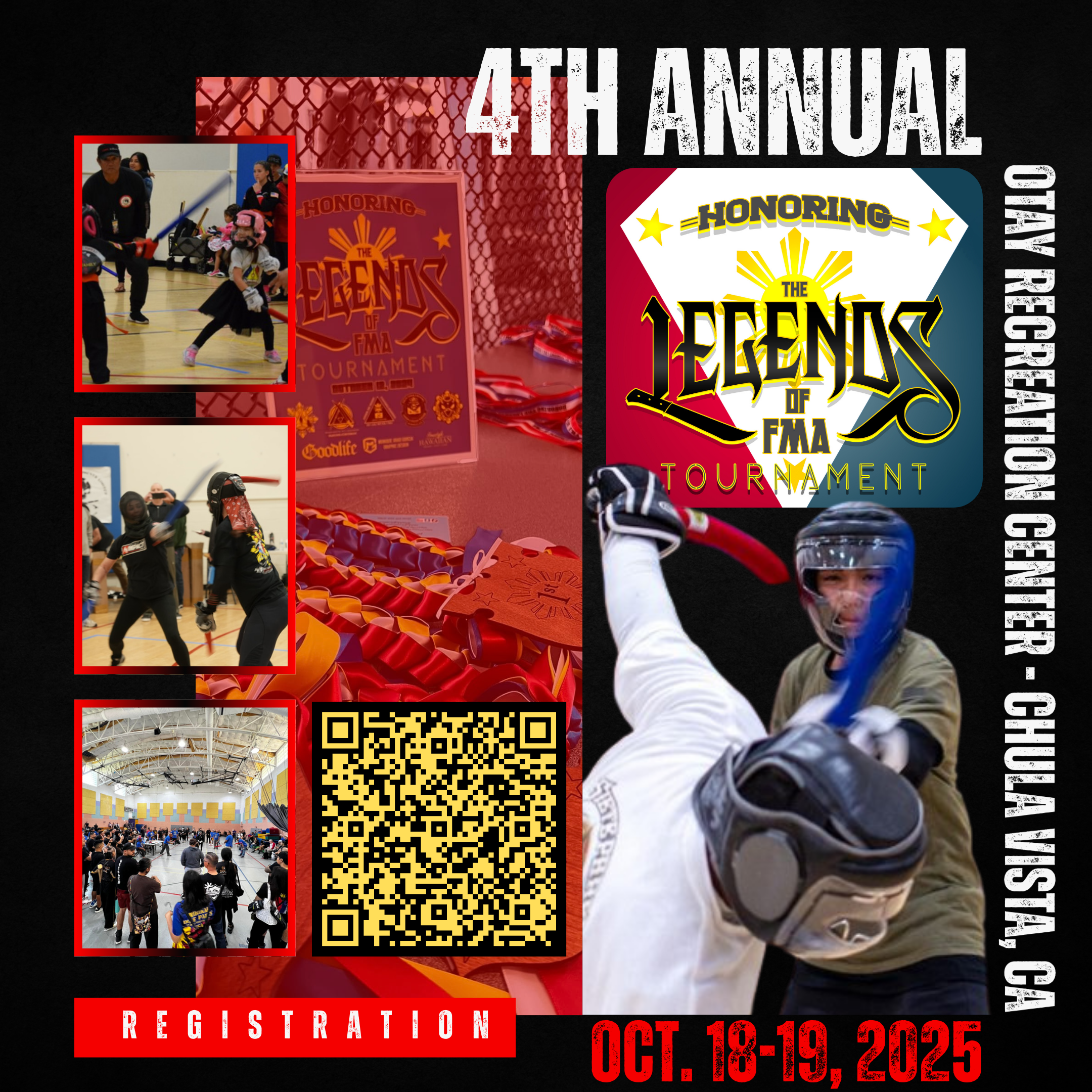 The following groups have come together to promote FMA and to honor the “Legends” that have paved the way for our systems to thrive. Triple 7 Eskrima - Texas L.L.C under Master Erik Buenaflor; Intrepid Arnis-Eskrima under Master Romeo De Los Reyes; Pulahan-Derobio Eskrima under Senior Master Chaz Siangco, Inayan Martial Arts Association under Guro Norm Malonzo, and 12Pares Eskrima Orihinal under Grandmaster Steve Del Castillo will be hosting the 4th Annual “Honoring the Legends of FMA” Tournament to be held on October 18, 2025 at the Otay Recreation Center in the City of Chula Vista, CA.